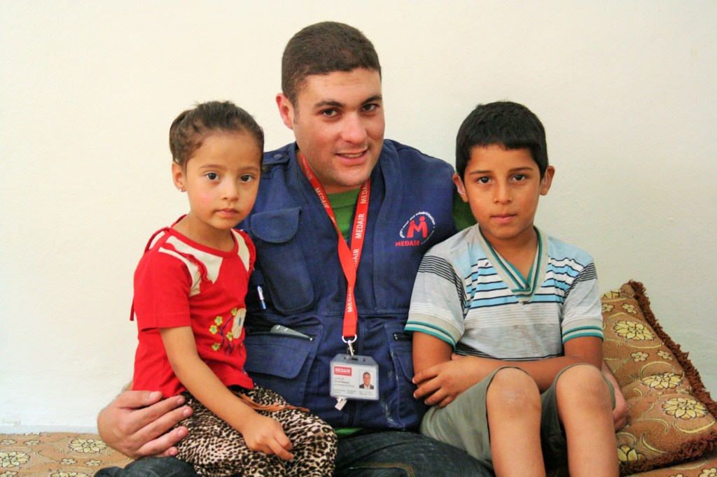 Syrian refugee Khalid and his sister with aid worker Ali in Mafraq, Jordan