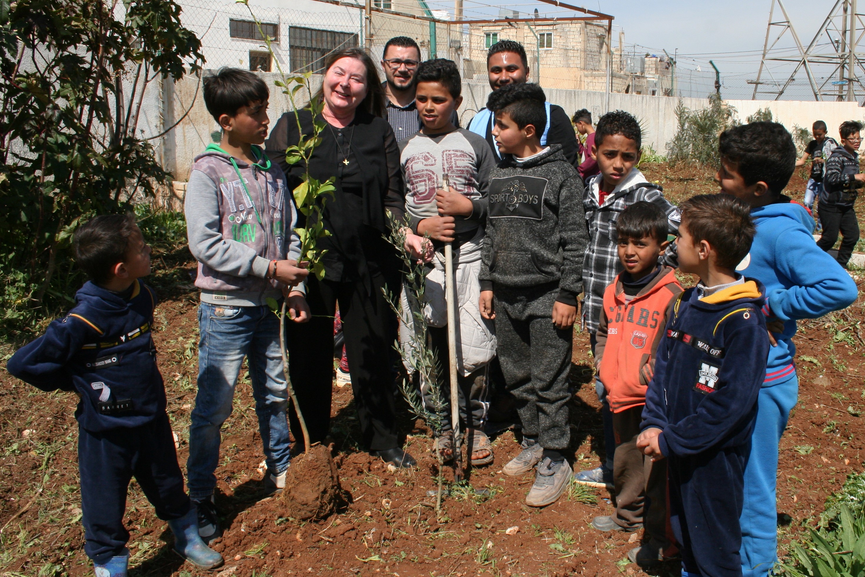 The sunshine is great but when it gets too hot, here in the UK we can sit in the shade of a tree to cool off. In the deseert landscapes of Jordan it’s not so easy to find shade from the burning sun, So it’s good to remember the refugees in Irbid, Jordan who have enthusiastically embraced a new project, planting a community garden. This project has involved the whole community, from the youngest to the oldest, whole families turning out to plant young eucalyptus, fig, olive and rose trees on a plot of land next to the community playground. The refugee camp is crowded, dusty with no space, so creating a tree shaded garden will give refugee families a much needed area for rest and relaxation.